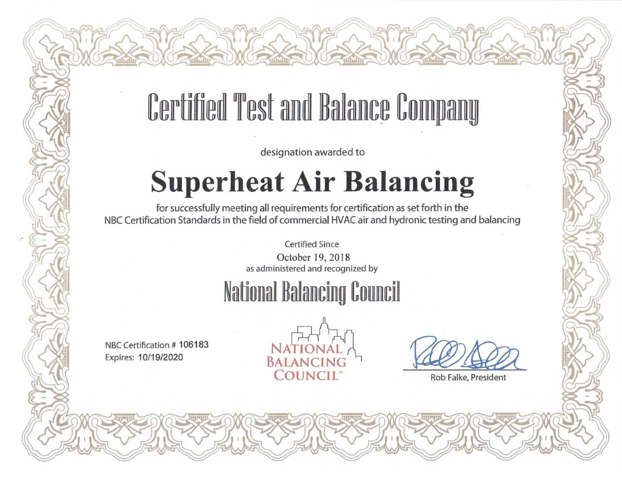 We are an independent, Certified Test and Balancing Agency. Our sole operation consists of Testing and Adjusting HVAC and Environmental Systems. Superheat was founded in 1962, and has been Certified with The National Balancing Council since 2012. We feel especially qualified since our Technicians and Engineer have extensive knowledge as to the procedures, requirements, & documentation necessary to complete any project. Superheat Air Balancing is a National Balancing Council (NBC) certified firm, providing commercial HVAC TAB services. We have served engineers, architects, contractors, industry and business for the past 56 years.